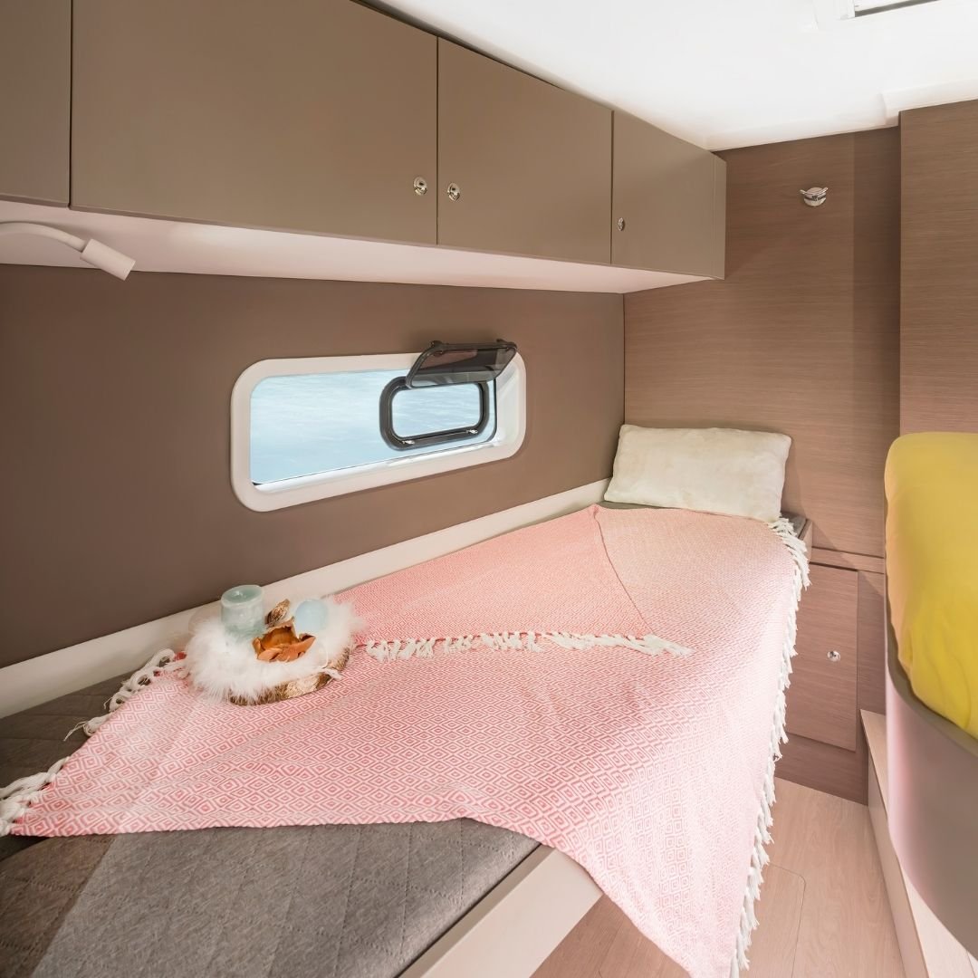 Con capacidad para hasta 8 huéspedes y 4 cabinas (2 dobles y 2 triples), el Bali Catspace es perfecto para familias, grupos o parejas que buscan confort, privacidad y aventura. Dispone de 4 baños con ducha, una planta potabilizadora de 100 l/h, equipo de sonido, WiFi, paneles solares, paddle surf, kayak y tender con motor de 10CV, garantizando una experiencia cómoda, autónoma y respetuosa con el entorno. Equipado con dos motores de 40 CV y bajo consumo, este catamarán ofrece eficiencia, estabilidad y una travesía tranquila por las costas más bellas del Mediterráneo.