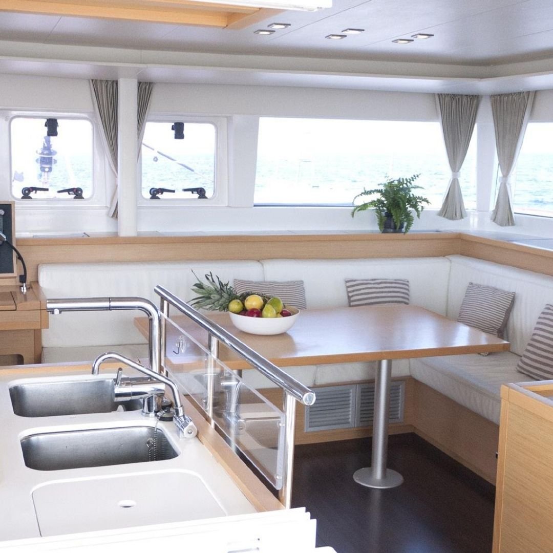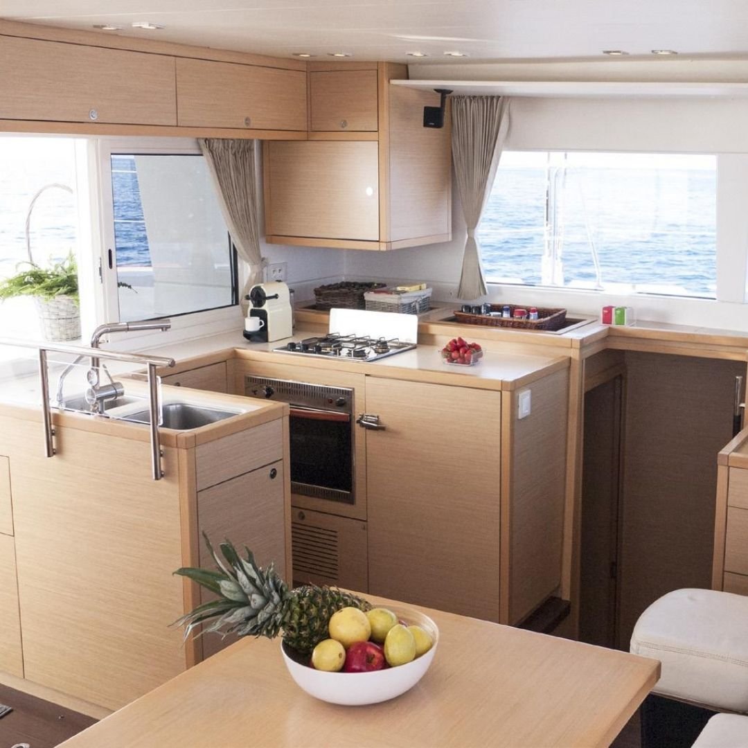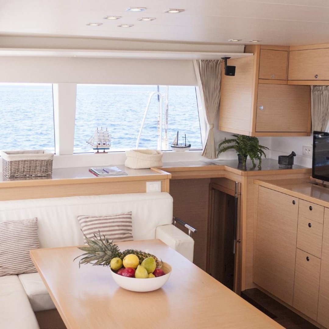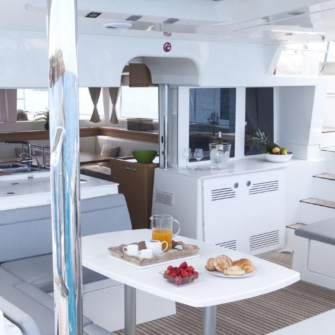 El salón panorámico con cocina integrada ofrece una vista privilegiada del entorno, mientras que en cubierta se puede disfrutar de zonas de relax como el flybridge, colchonetas en proa, toldos, dos paddle surf, ducha exterior y una amplia bañera con mesa para 10 comensales. Equipado con aire acondicionado en todas las cabinas, potabilizadora, generador, lavavajillas, microondas, cafetera Nespresso y sistema de sonido Alpine, garantiza una experiencia náutica con todas las comodidades de un alojamiento de cinco estrellas.