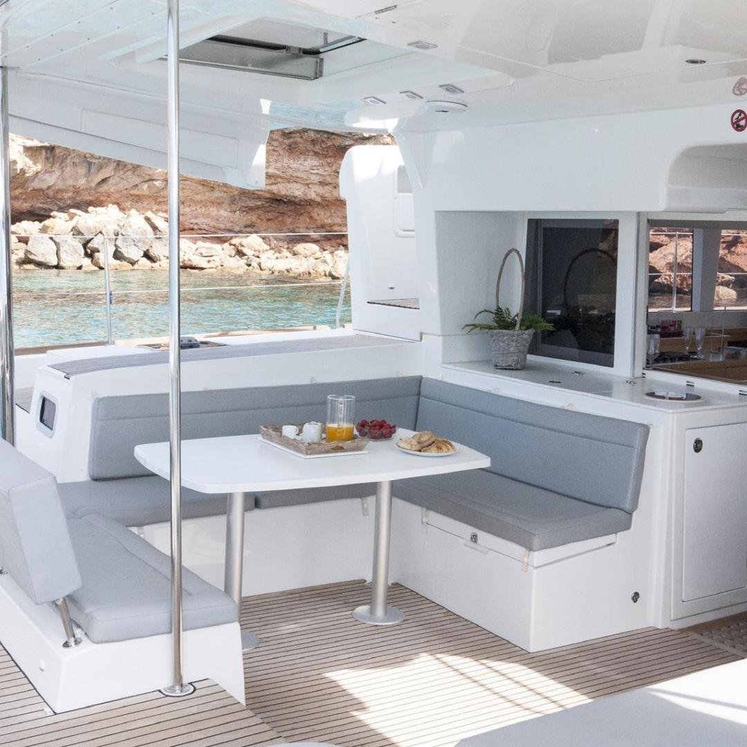 Lagoon 450: elegancia, confort y tecnología a bordo. Un catamarán ideal para descubrir Ibiza con servicio y estilo inigualables.