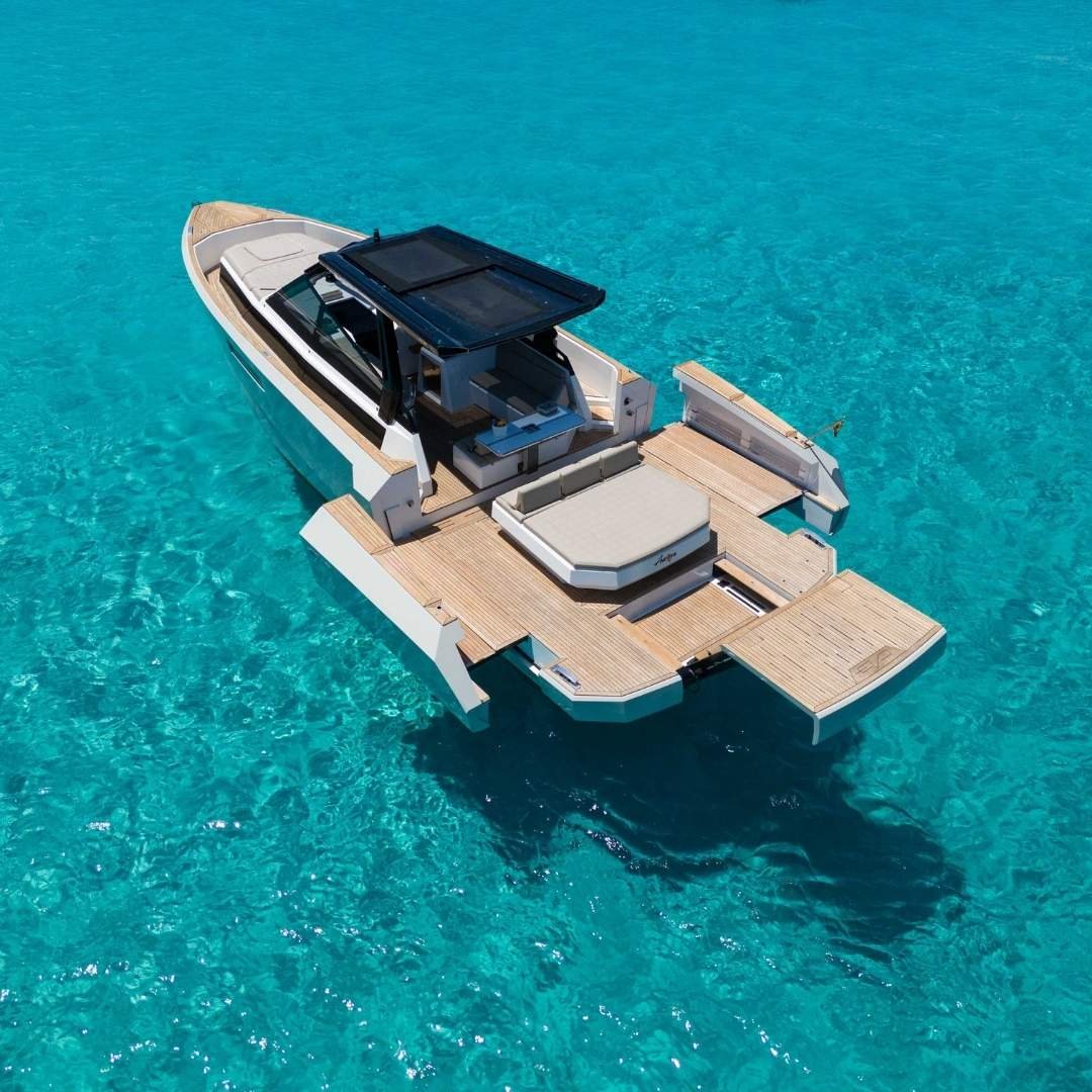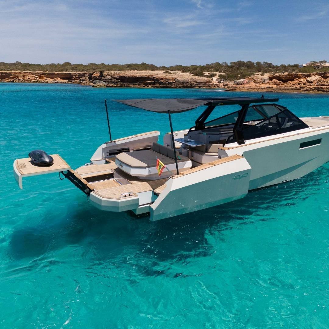 EVO 43 Aurora, lancha de lujo con plataforma hidráulica y casco extensible. Ideal para hasta 11 personas y escapadas exclusivas desde Ibiza.
