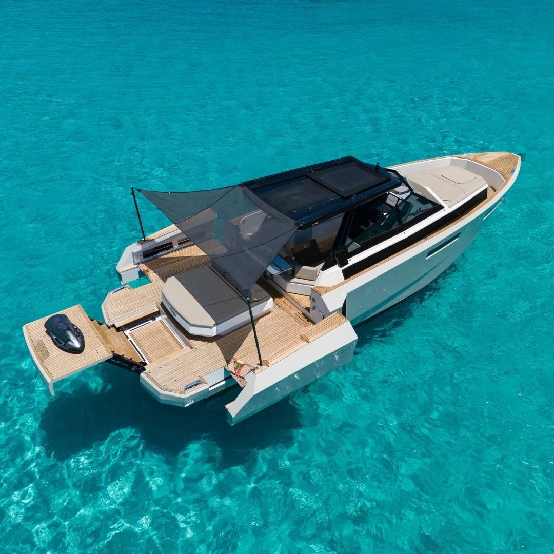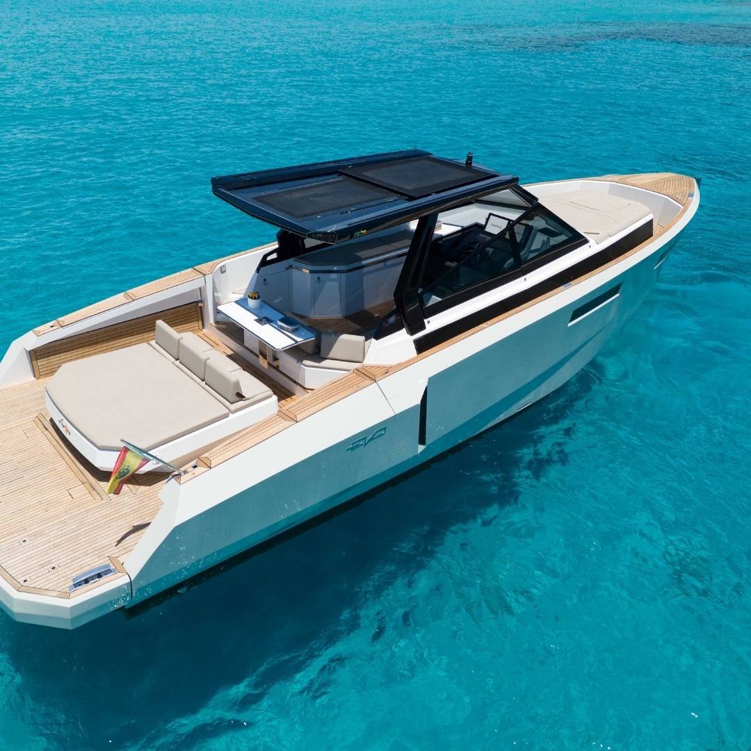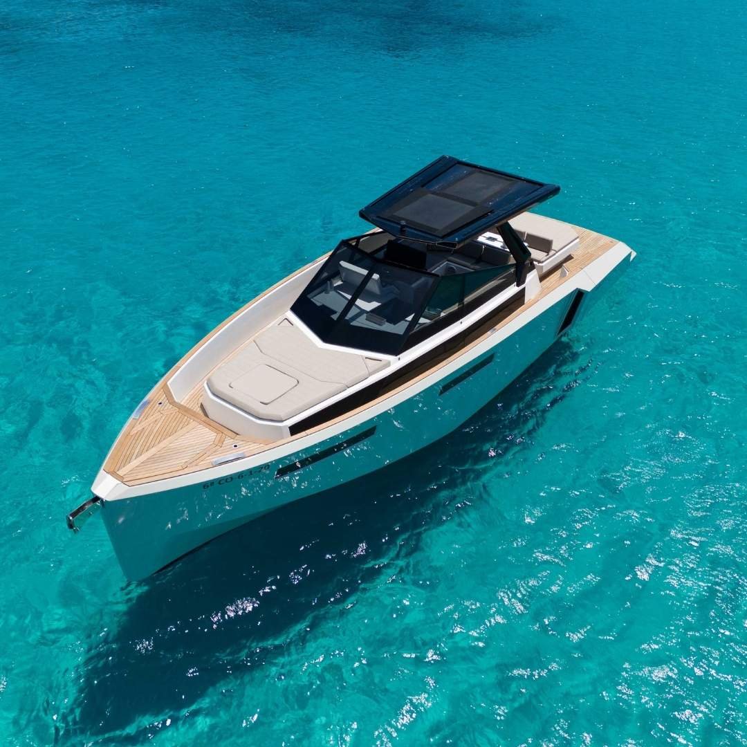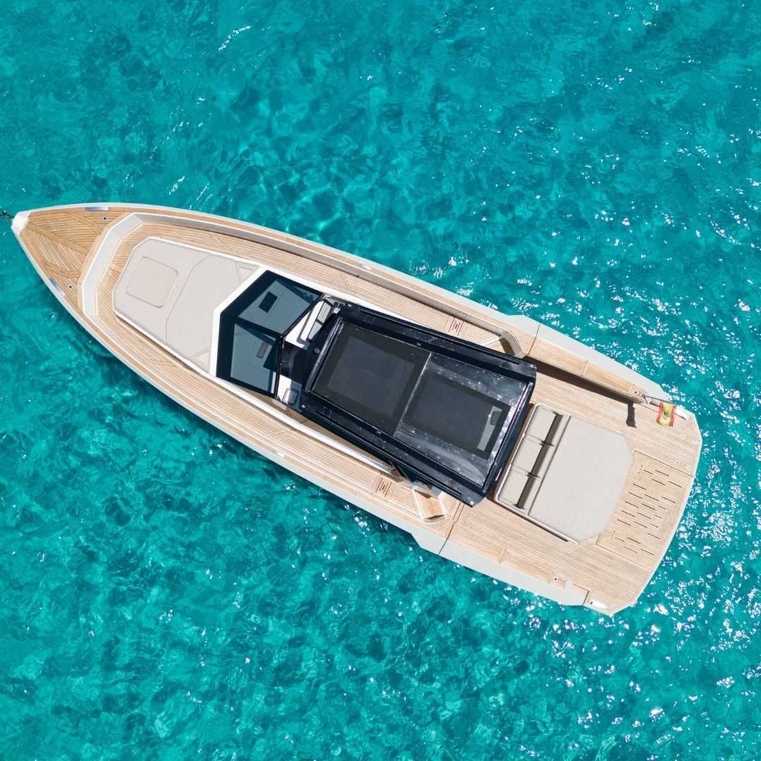 Capaz de albergar hasta 11 pasajeros durante el día, la EVO 43 también ofrece una cabina con cama doble y baño completo para quienes desean una experiencia nocturna en puerto. Equipada con soláriums en proa y popa, área exterior con mesa, nevera portátil, sistema de sonido con conexión Bluetooth, paddle surf, equipo de snorkel, Seabob, toallas, snacks y una cuidada selección de bebidas, cada detalle ha sido pensado para el disfrute absoluto.