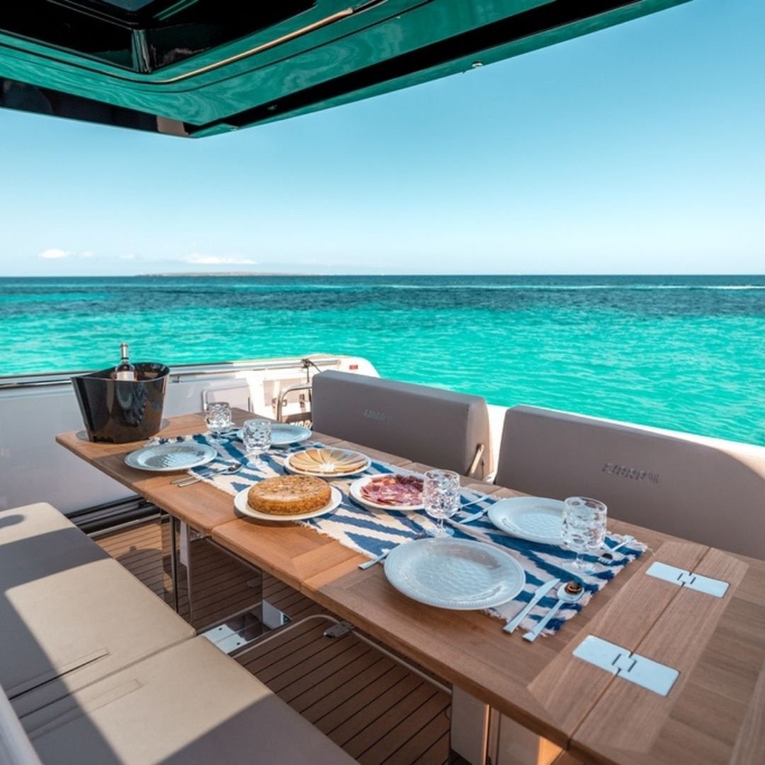 Incluido en el precio: amarre en Marina Botafoch, seguro a todo riesgo, selección de bebidas, impuestos de puerto, equipo de snorkel, paddle surf, sistema de música Bluetooth, toallas, IVA 21%.