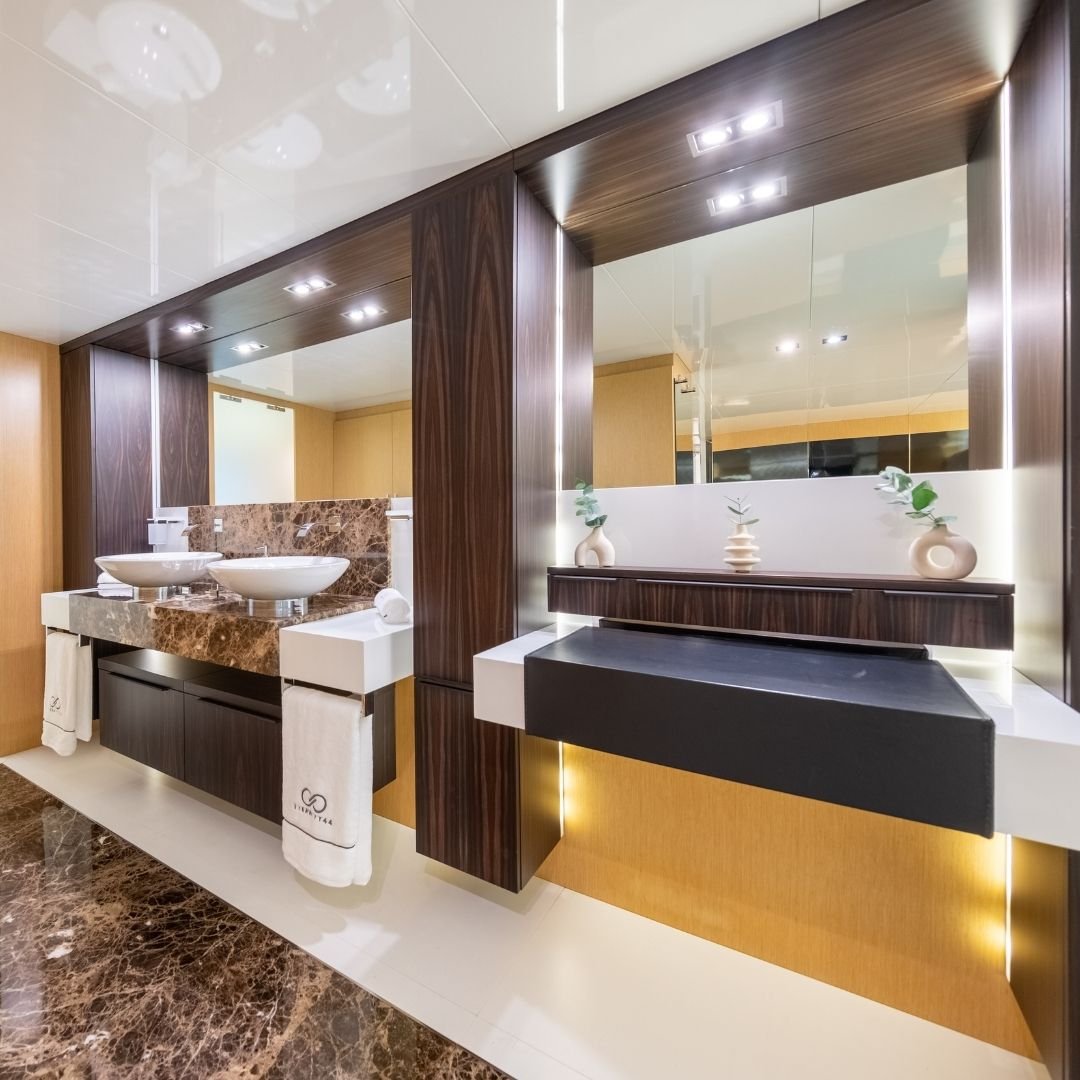 Con capacidad para 12 invitados durante el día y pernocta para 8 personas distribuidas en cuatro camarotes de gran amplitud –incluyendo cabina del armador, cabina VIP y dos twin con cama supletoria– este yate garantiza privacidad y descanso de primer nivel. Equipado con dos motores MAN de 730 HP, estabilizadores de navegación y fondeo, y un consumo de 250 L/h, la experiencia es tan silenciosa como potente. La tripulación está compuesta por capitán, marinero, cocinero y dos azafatas, garantizando un servicio personalizado y atención al detalle en cada momento.