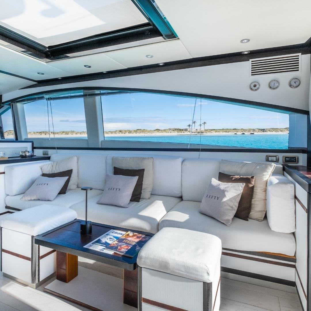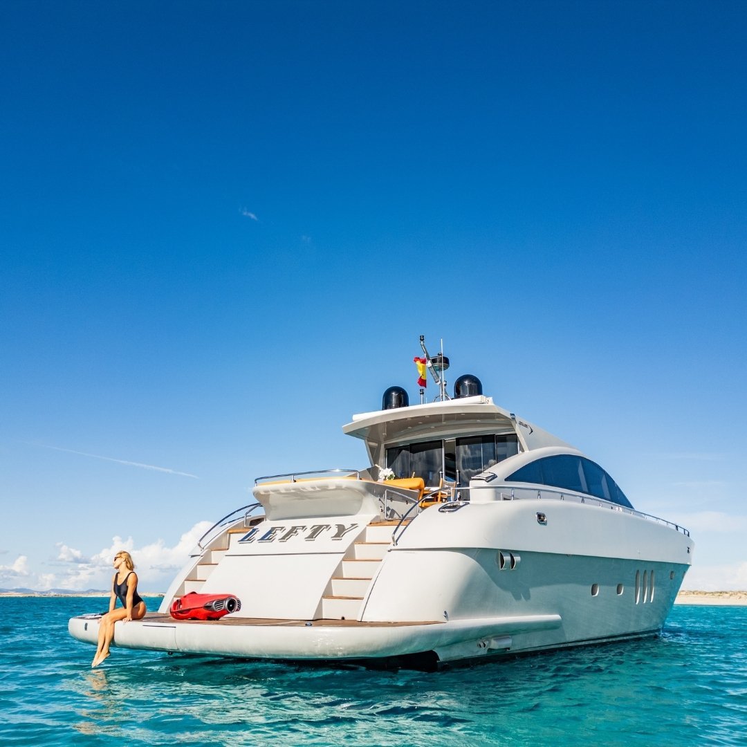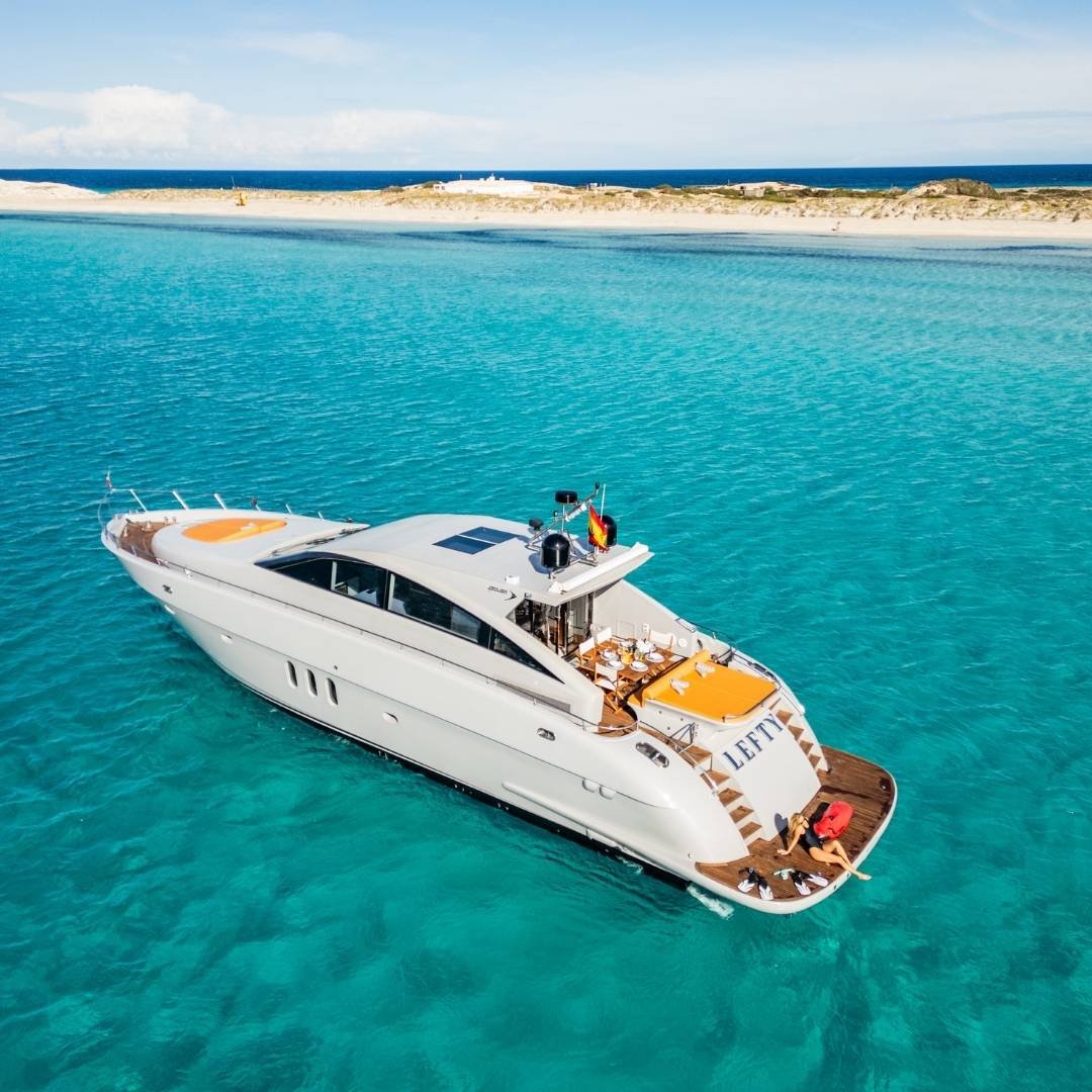 Jaguar 72 “LEFTY” es un yate de lujo de 23 metros con tres cabinas, ideal para navegar Ibiza con estilo, potencia y tripulación profesional.