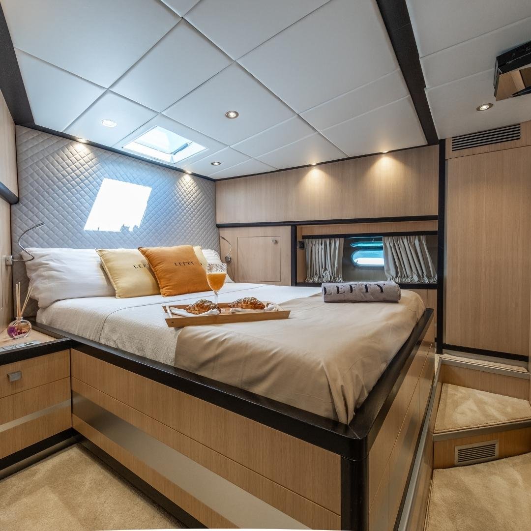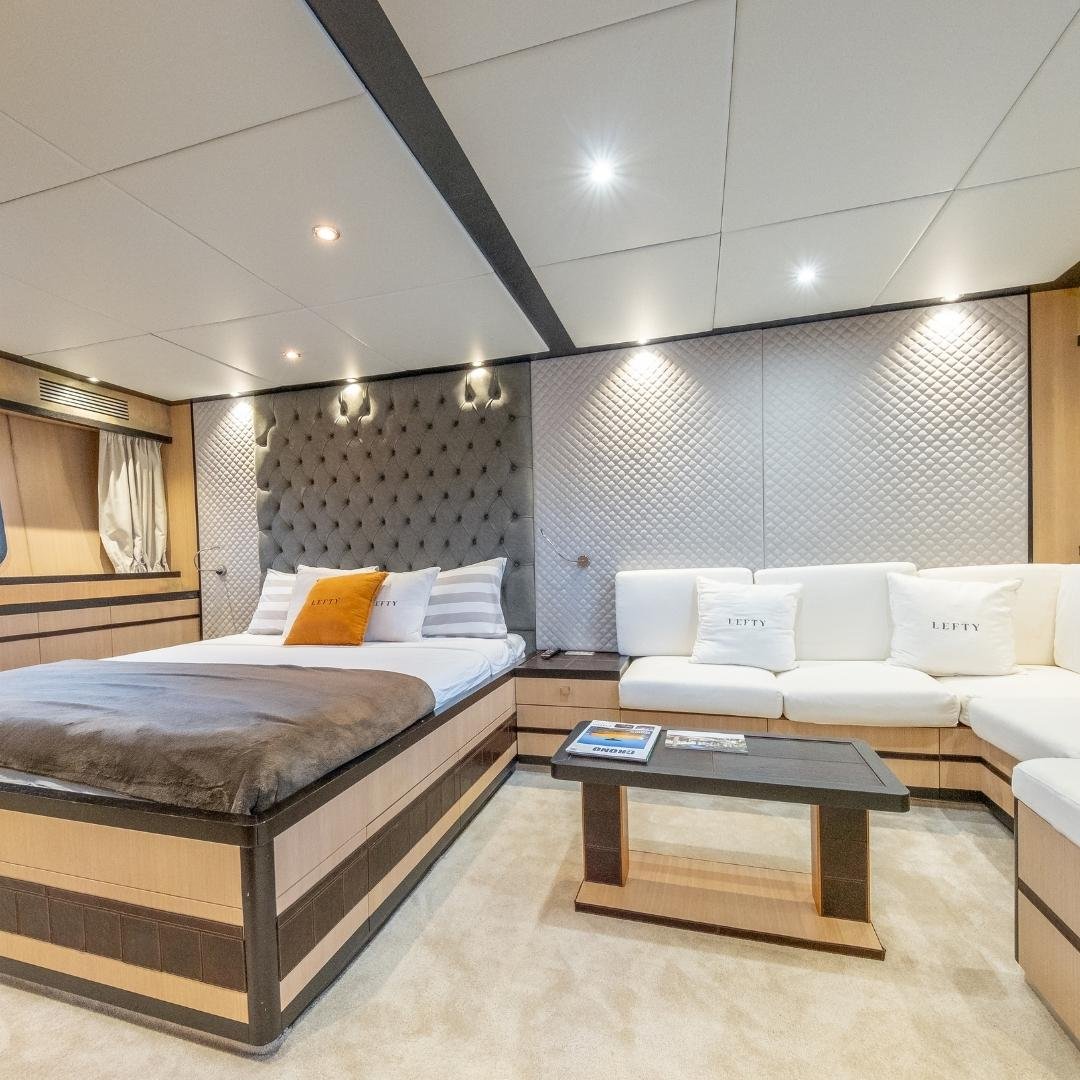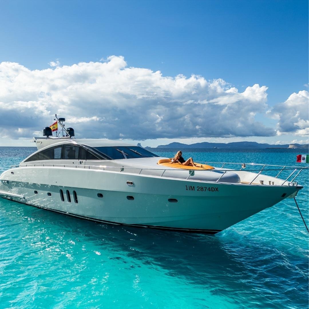 Jaguar 72 “LEFTY” es un yate de lujo de 23 metros con tres cabinas, ideal para navegar Ibiza con estilo, potencia y tripulación profesional.