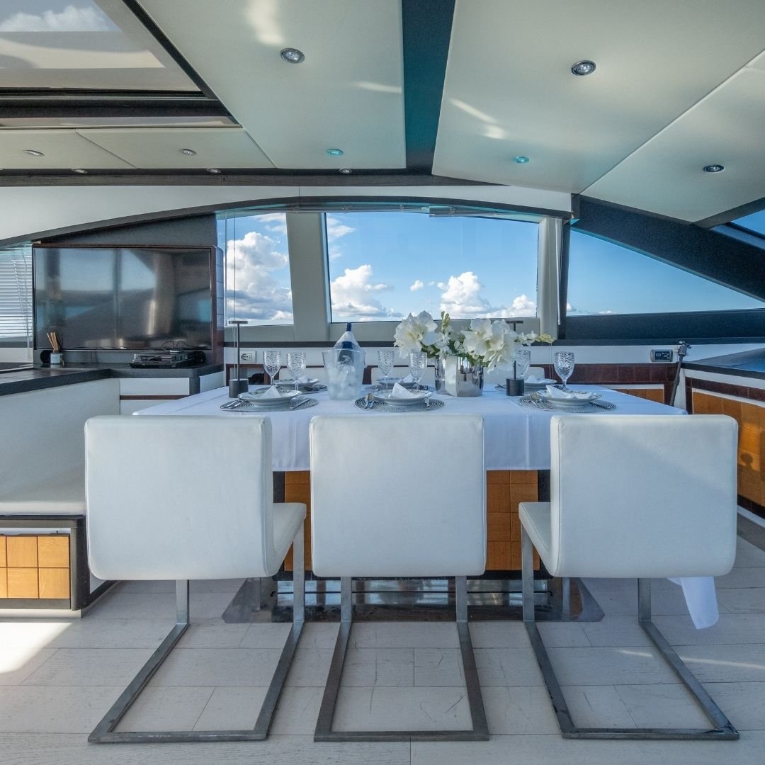 Impulsado por dos potentes motores MAN de 1.300 CV cada uno, alcanza velocidades con suavidad y eficiencia, consumiendo 450 litros por hora. Ofrece capacidad para 12 invitados más 2 tripulantes durante el día, y pernocta en tres camarotes cuidadosamente diseñados: dos dobles y uno triple, acompañados por tres baños completos que garantizan comodidad y privacidad.