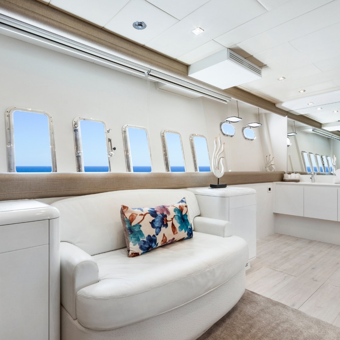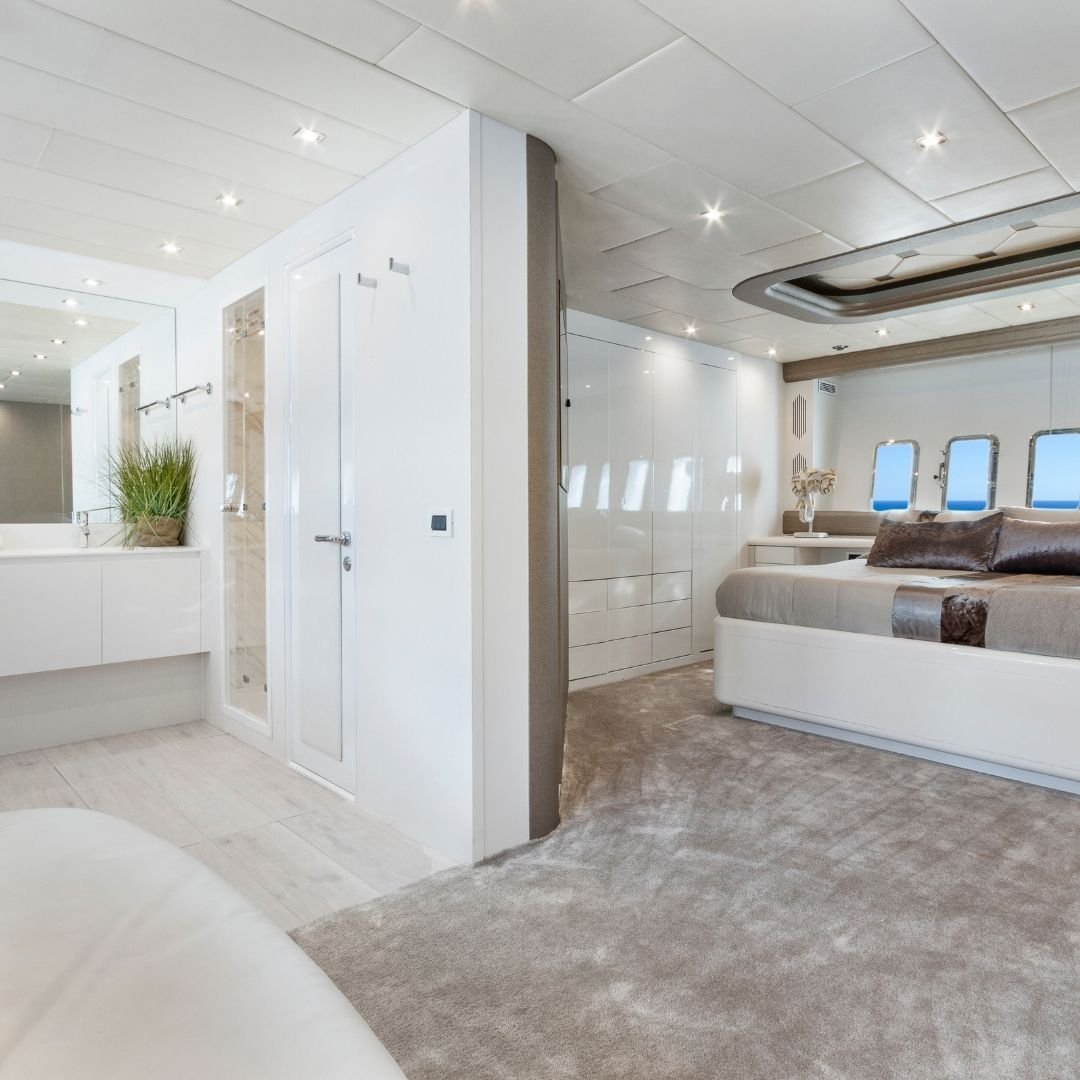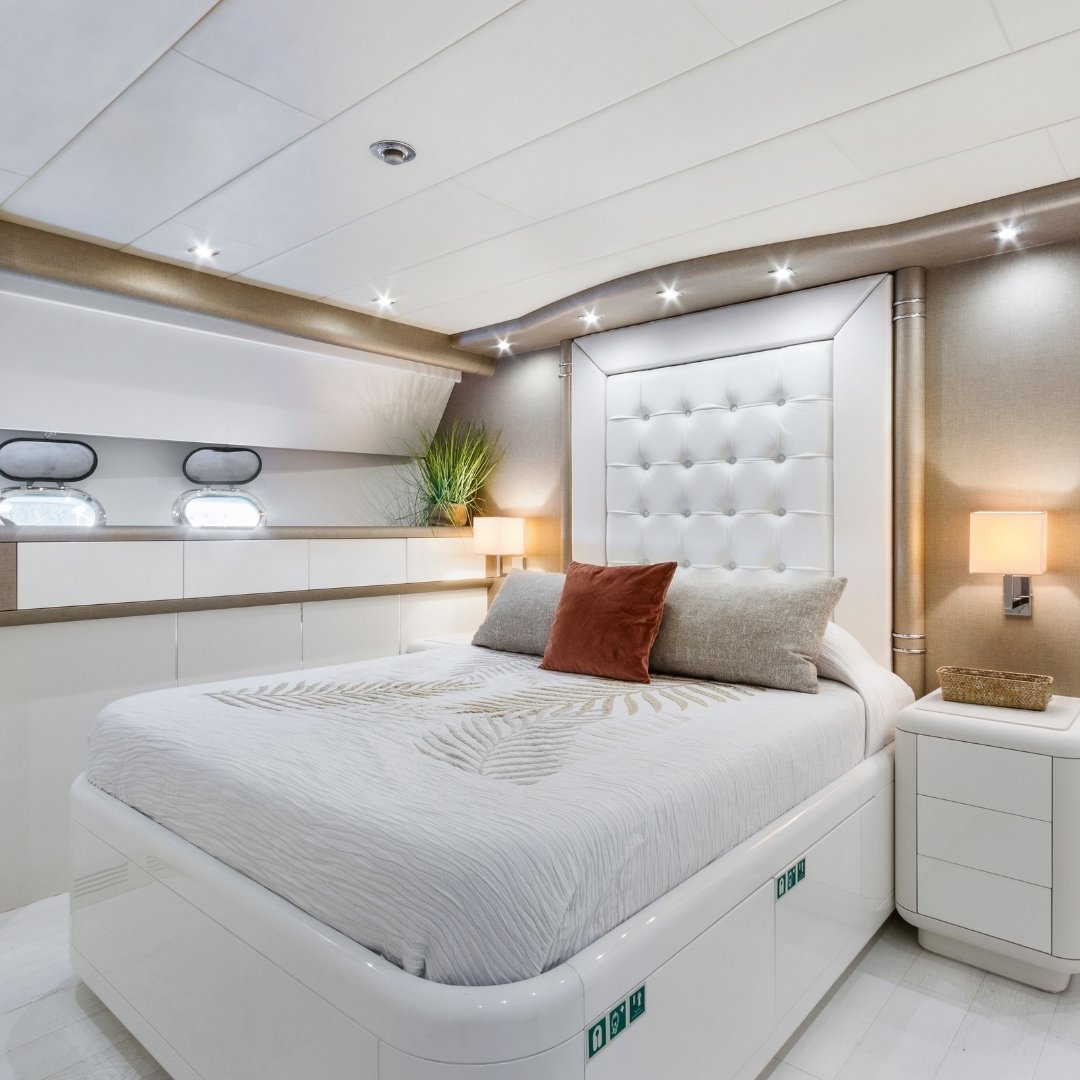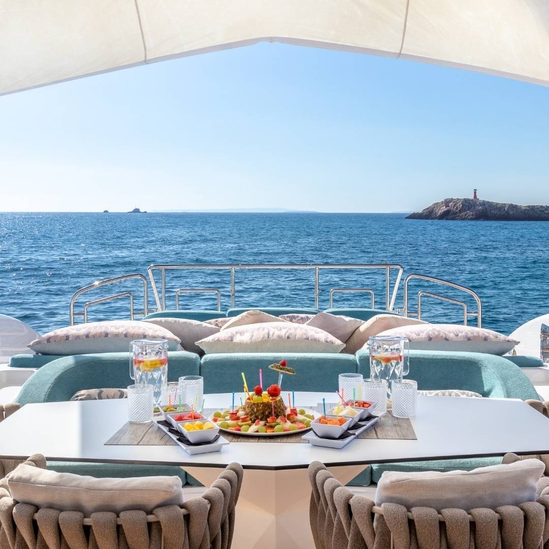 Con capacidad para 12 personas de día y 10 durante la noche, gracias a sus 4 camarotes —tres dobles y uno cuádruple— todos con baño en suite más un baño de cortesía, este yate es perfecto para familias, grupos de amigos o celebraciones privadas. Propulsado por dos motores MTU y con una velocidad de crucero de 28 nudos (máxima 36), el Mangusta 108 ofrece una navegación potente y suave, con un consumo aproximado de 990 L/h. A bordo se disfruta de estabilizadores Seakeeper, WiFi, sistema de sonido Bose Surround, dinghy y una variedad de juguetes acuáticos como wakeboard, esquís, equipos de snorkel y Seabob (bajo petición). El yate zarpa desde Marina Botafoch y cuenta con una tripulación profesional para garantizar una estancia impecable.